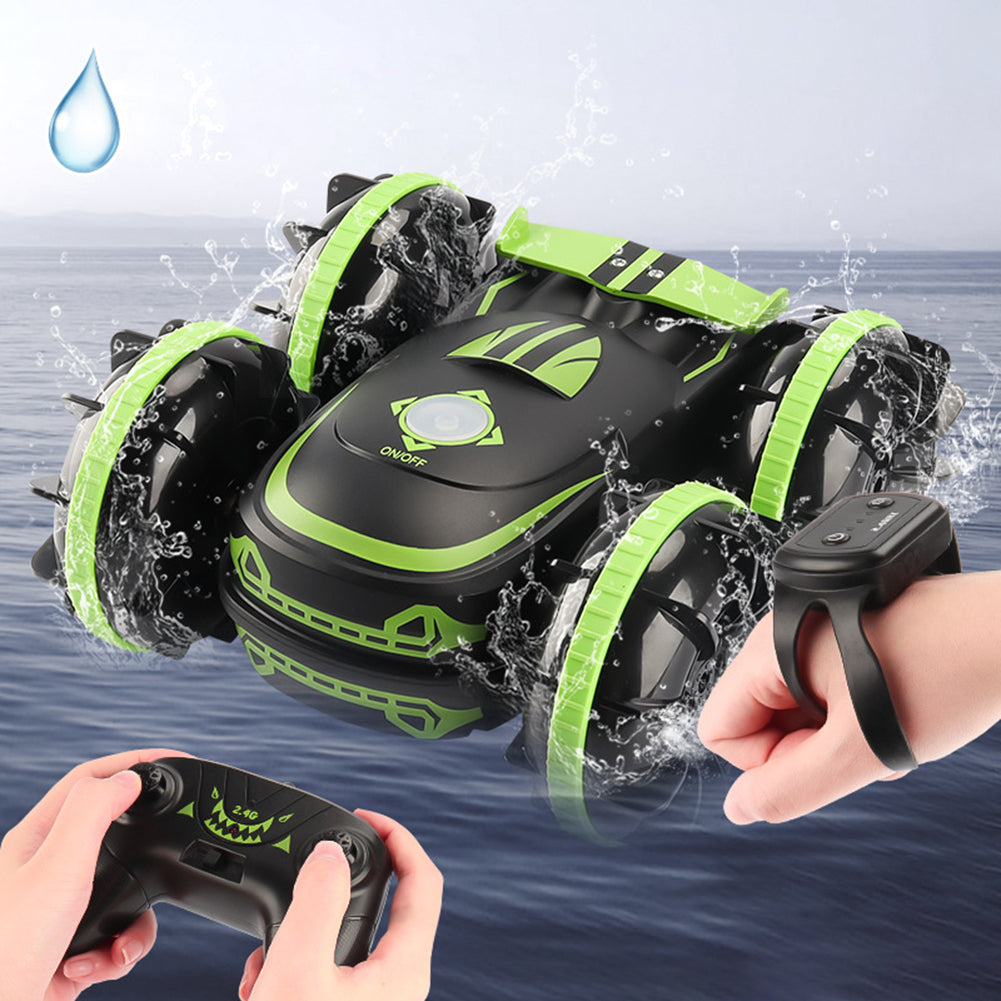 2.4g Remote Control Car Double-sided Tumbling Amphibious Stunt Car Green handle+watch control