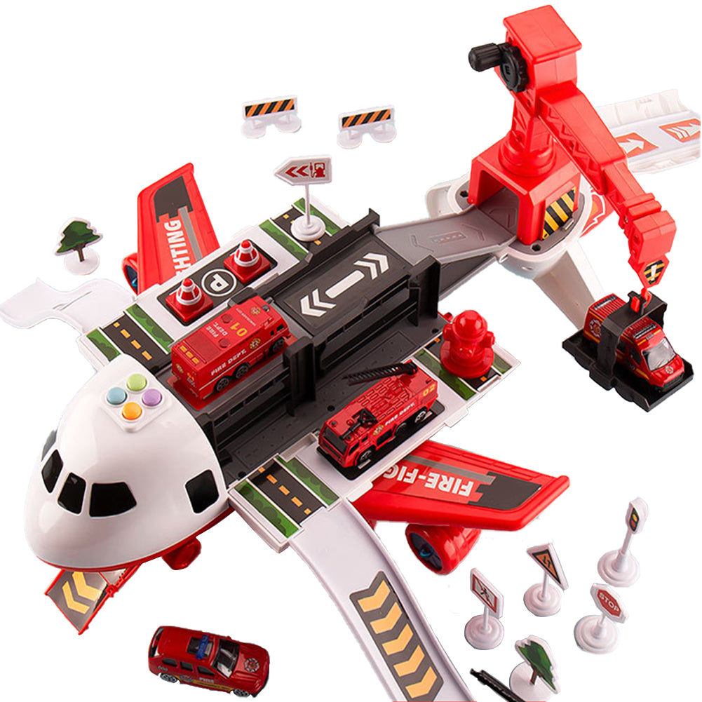 - Cars and airplanes are combined together. Your child and their friends will have a great time playing with an airplane with tracks, toy cranes, mini game cars, and road signs.