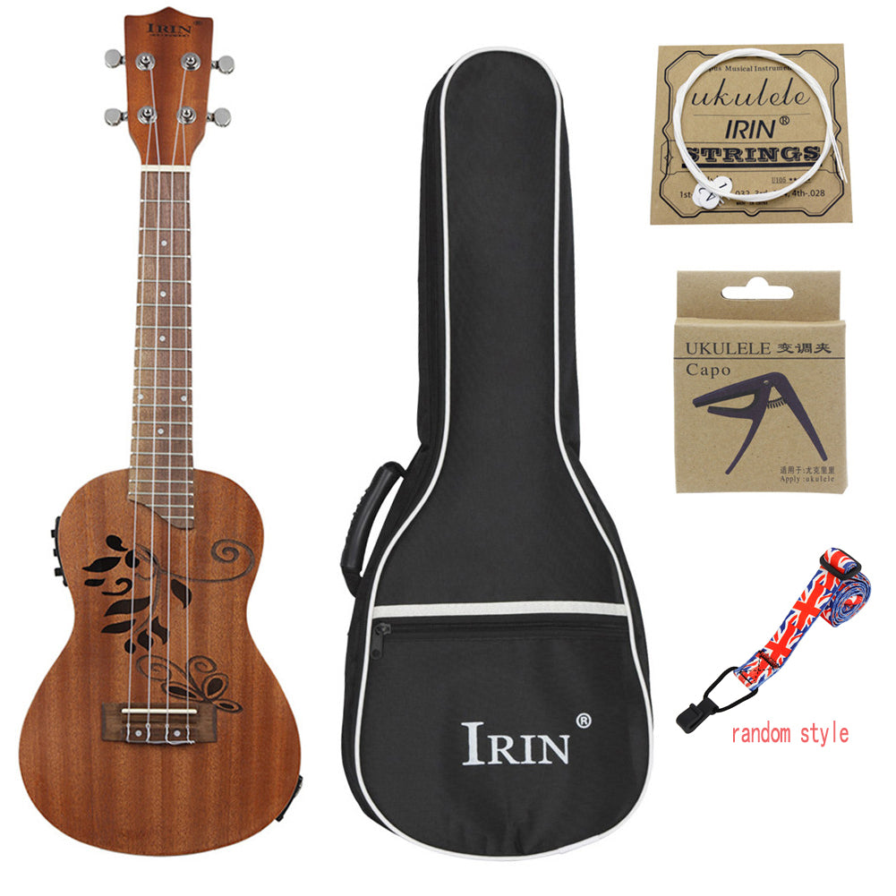 24inch Ukulele Sapele Wood Hollow Carved with LCD EQ Tuning Display Capo Strings Strap Musical Instrument for Ukulele Beginner Wood color
