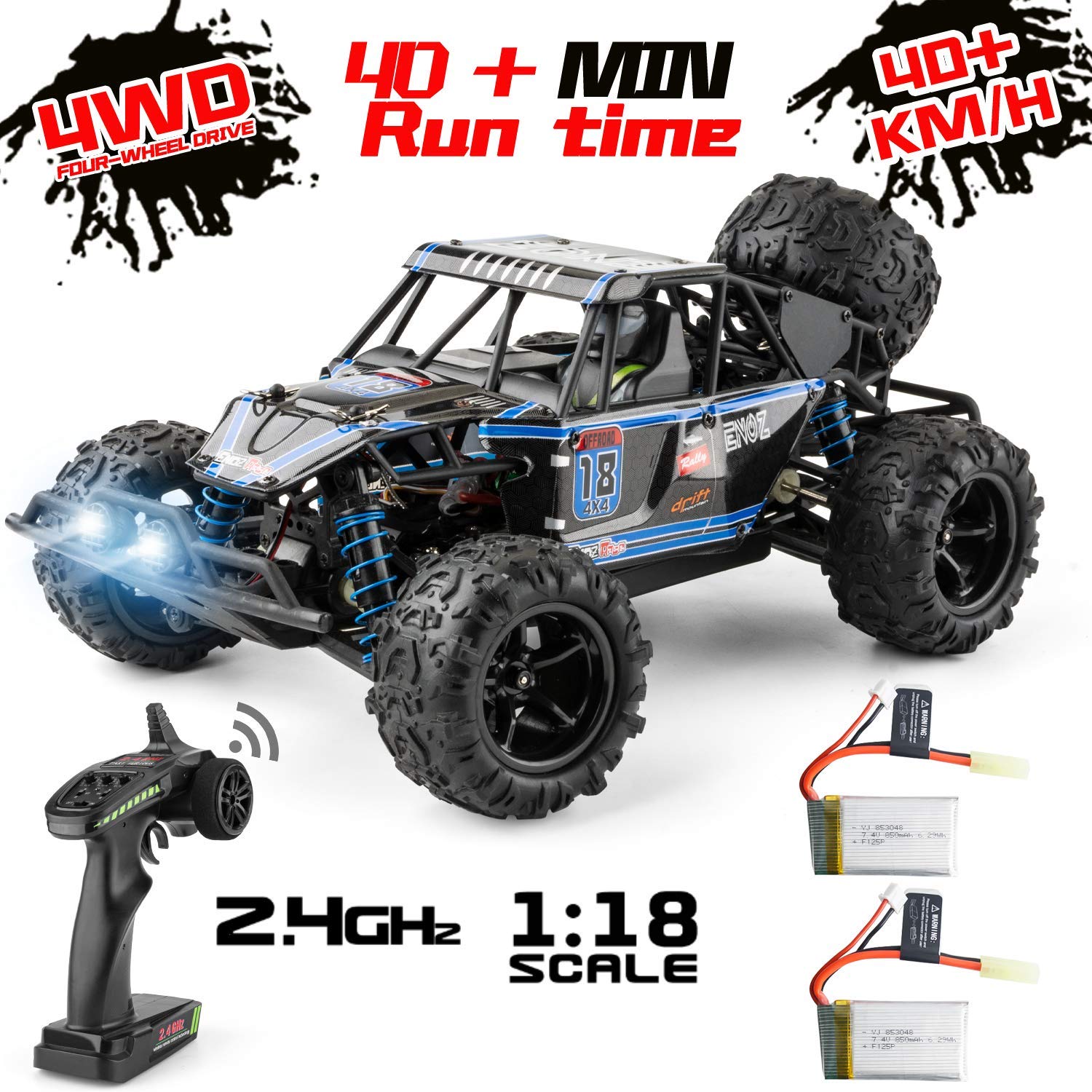 9303E 1:18 Scale Remote Control Car 40+km/h High Speed Off Road Vehicle Toys RC Truck for Kids and Adults 2 batteries